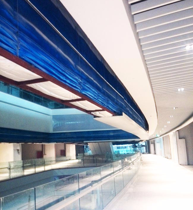 ▶ 防火卷帘门同防火墙的作用一样起到水平防火分隔,它由帘板、座板、导轨、支座、卷轴、箱体、控制箱、卷门机、限位器,门楣、手动速放开关装置、按钮开关和保险装置等13个部分组成,一般安装在不便采用防火墙分隔的部位。如:敞开电梯厅、自动扶梯、百货大楼的宽大营业厅、展览楼的展览厅和建筑物中洞口较大不能用防火门窗的部位。防火卷帘门在建筑工程中,使防火分隔得到了广大的应用。
